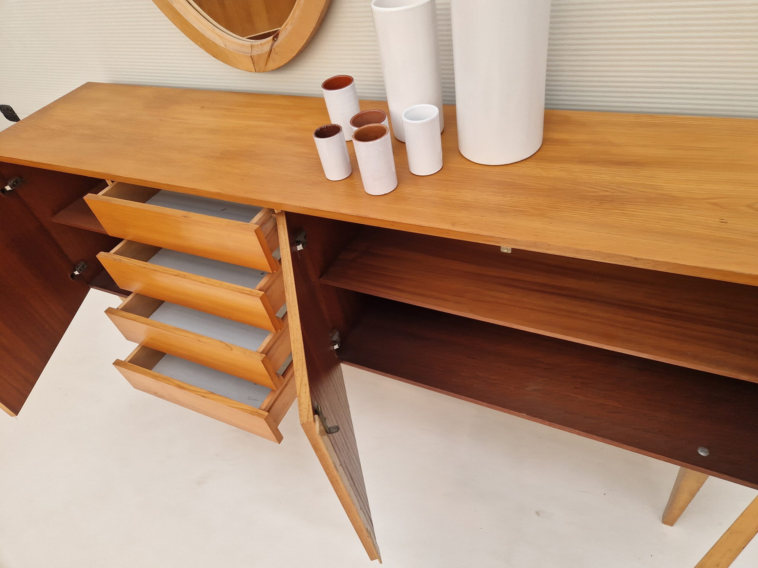 Vintage dressoir met een deurkast met een deur en een deurkast met twee deuren en vier laden. het dressoir staat op hoge poten.